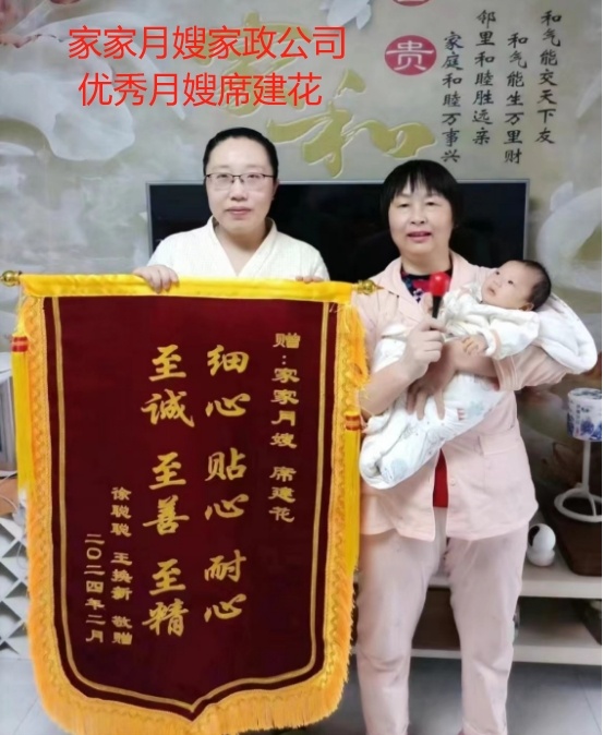 非常感谢,月子期间席阿姨的照顾,席阿姨非常仔细,细心照顾我和宝宝,做饭非常好吃,而且有两个加餐,为了下奶,煮的鱼汤、鸡汤,喝水果都很好吃,做饭相当合适。家里的活儿干得非常利索,我经常堵奶。席阿姨会催乳,会拍奶,帮我度过了胀奶期,堵奶的时候帮我排奶,对宝宝的非常耐心细心。在我家期间,席阿姨教会我好多育儿知识,教会我拍嗝了,喂奶啦,换纸尿裤了等等。告诉我很多带宝宝的专业知识。阿姨非常注意的细节,并且给家人,家里的老人交流也很融洽。交给他们现在的育儿观念,纠正过去的不对的育儿方式,并在离家前教我如何照顾宝宝,让我有信心自己照顾好孩子。感谢席阿姨这一个月的精心照顾,同时谢谢家家月嫂家政公司给我推荐一位好月嫂。